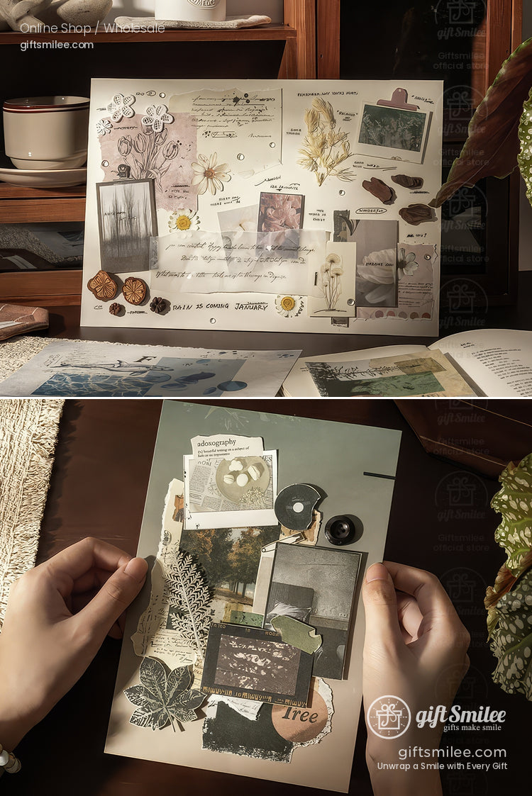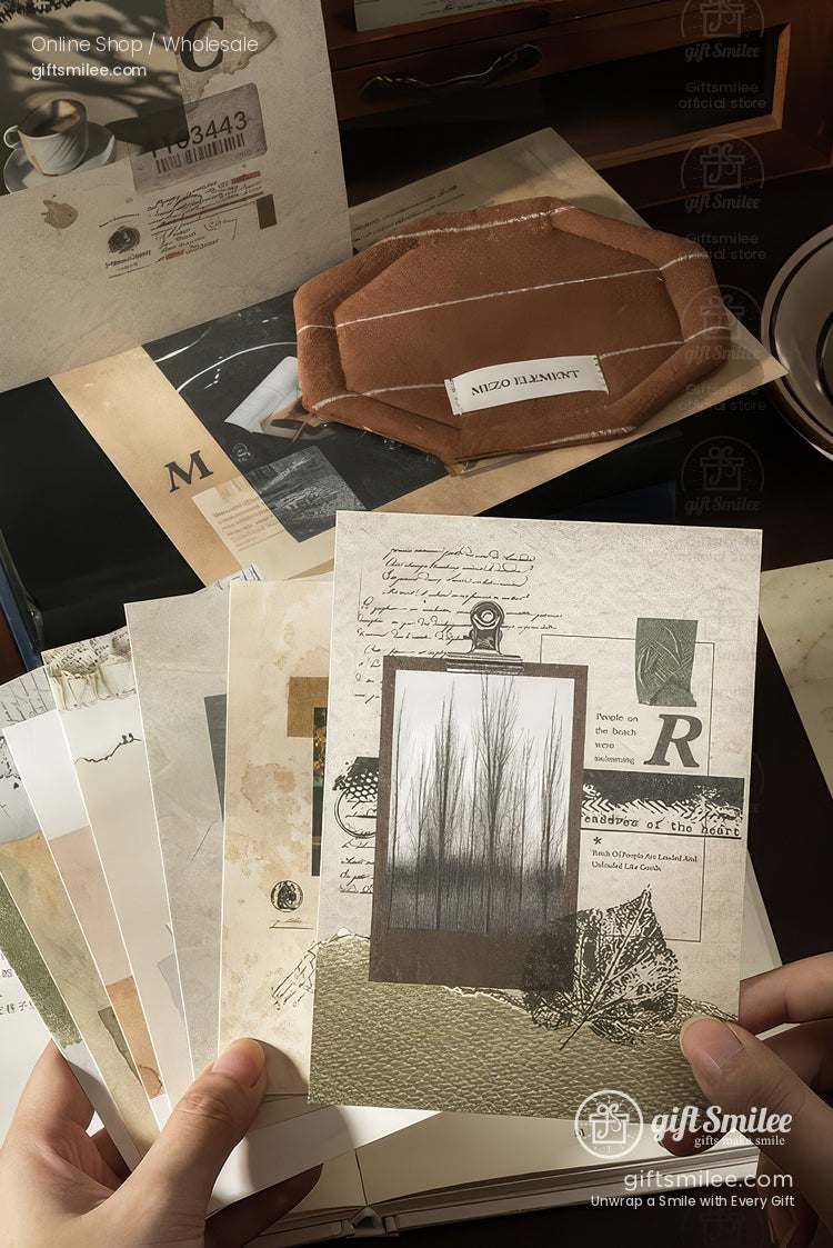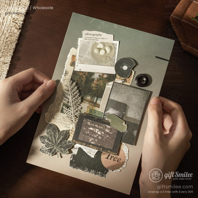 Faintly crinkled paper textured like old letters, soft olive and sepia tones, and layered images that whisper of quiet forests or fading postcards. There’s a sense of pausing mid-thought, your hand lingering over that perfect scrap to stick onto a journal page.