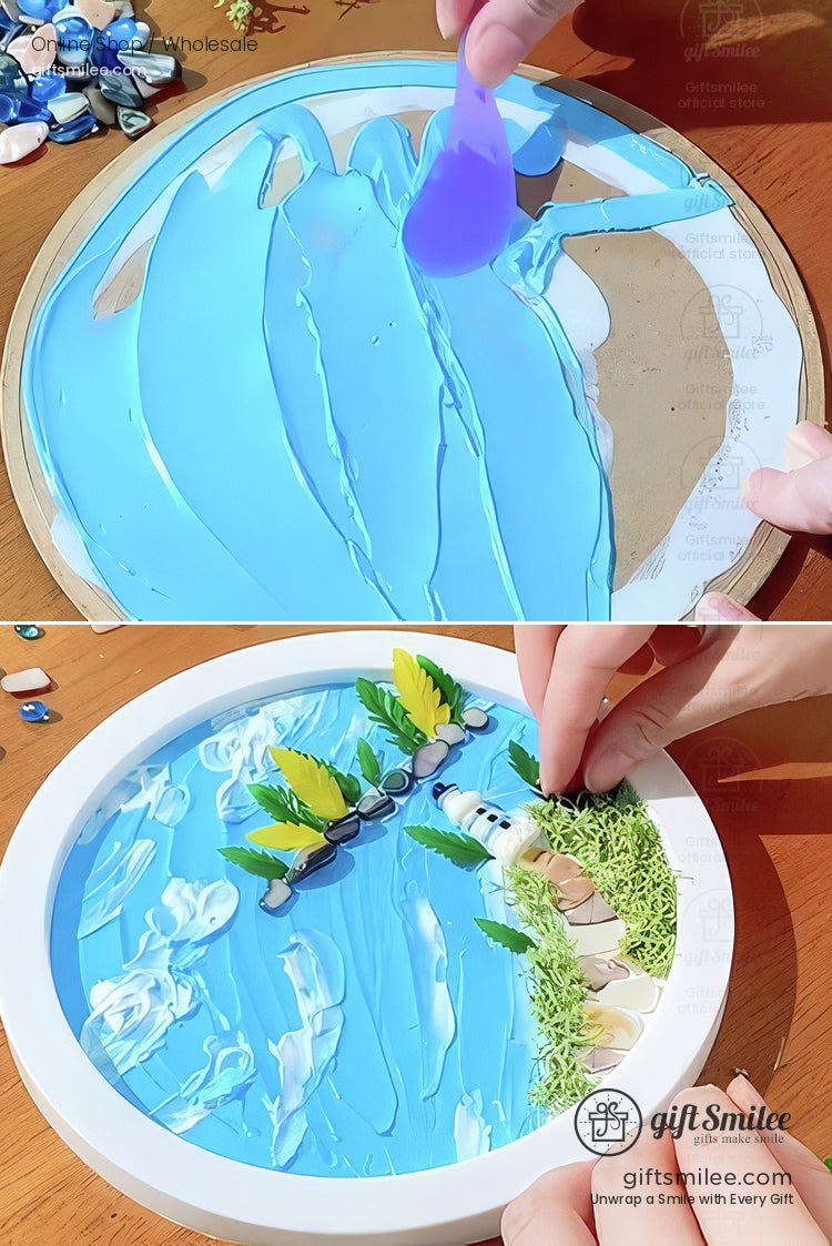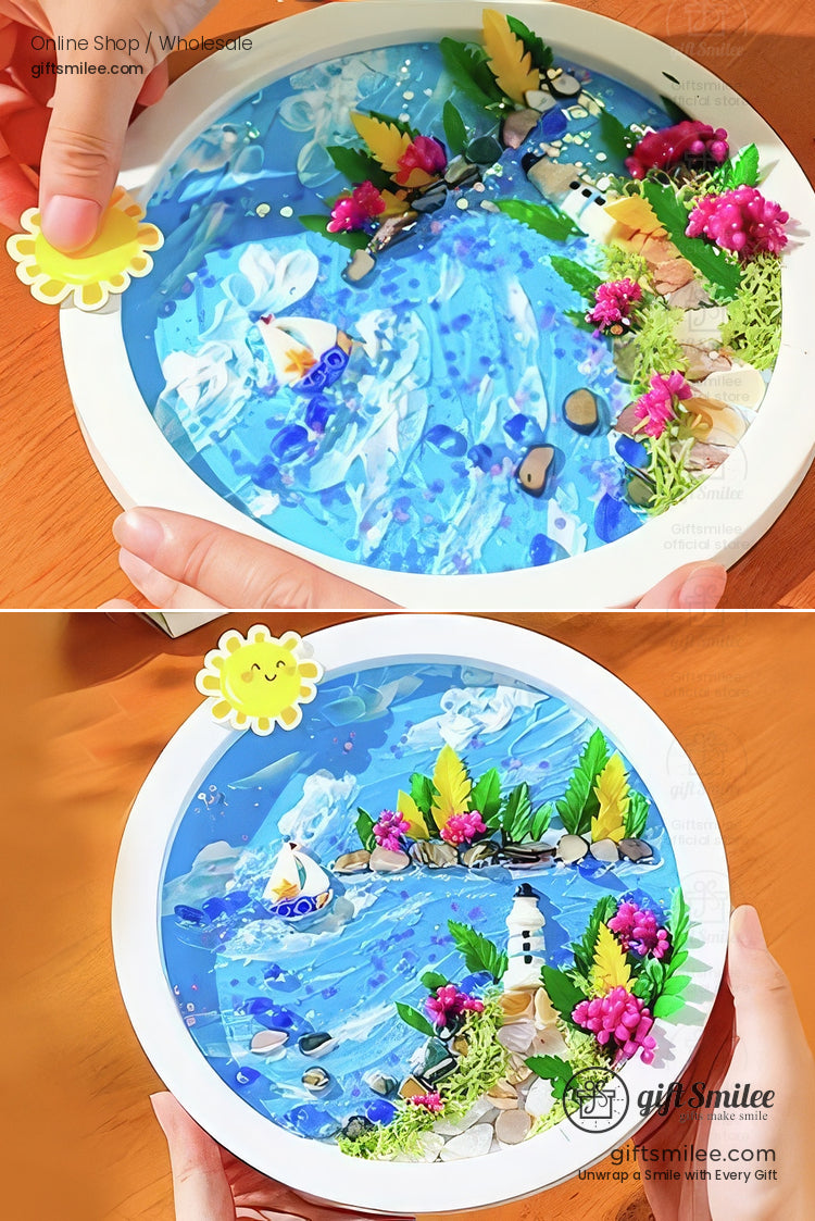 The soft squish of glue beneath your palms mingles with the faint crackle of crushed shells as you press them onto the canvas. Bold blues ripple alongside streaks of fiery orange, while tiny birds seem ready to soar from the frame itself. This is more than crafting—it’s shaping ocean dreams with your own fingertips.