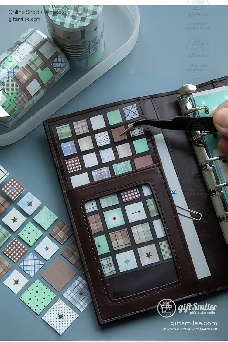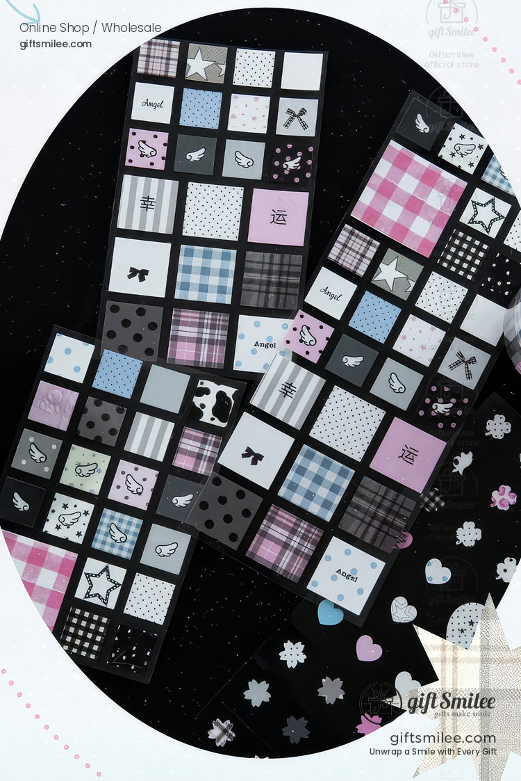 A desk scattered with cut-outs of pastel grids, stars, and plaid whispers of color. The peel of the sticker is crisp, the back adhesive smooth between your fingers. Each little square feels like a secret waiting to be told on a journal page or a handwritten letter.