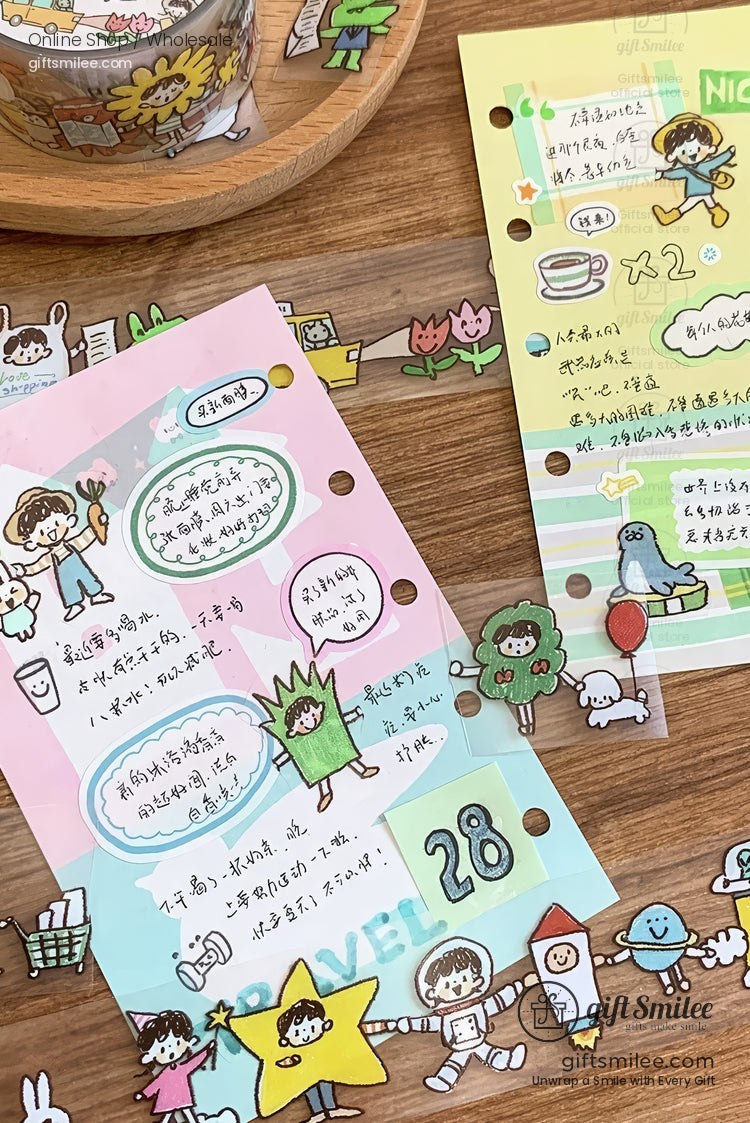 Little characters dart across the paper like scenes from a bustling cartoon. A girl with shopping bags, a boy chasing a butterfly, a cheerful panda—all sketched with a playful hand and colored in soft pastels. Each piece feels like plucking a moment from someone’s day, ready to brighten your notebook, planner, or wall.