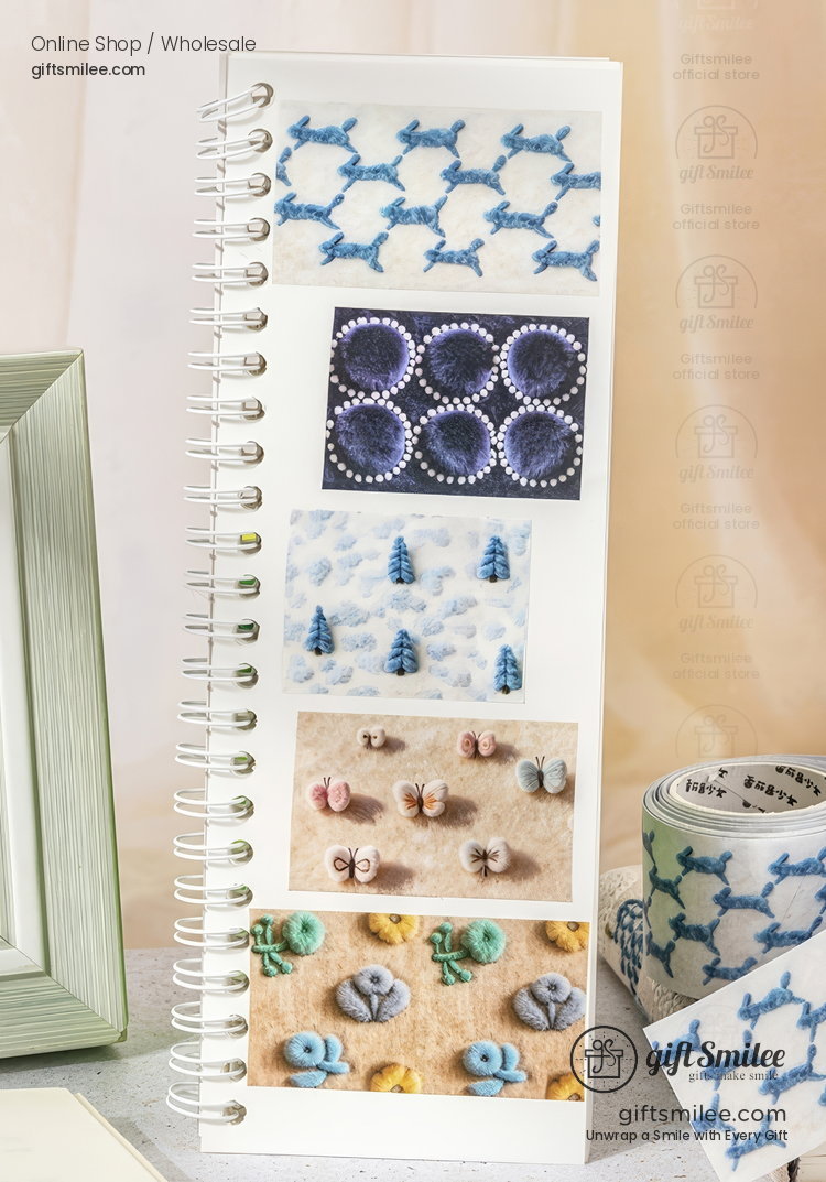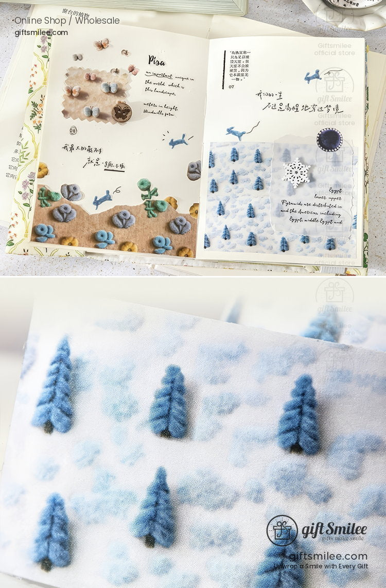 The soft blues, creamy beige, and charcoal tones unfold like a dream, each pattern resembling embroidered stories. Trees seem to sprout through snowfall, while butterflies gently rest on textured fields. A quiet moment on a rainy afternoon, as you layer these tapes into a journal, feels like stitching together little pieces of peace.