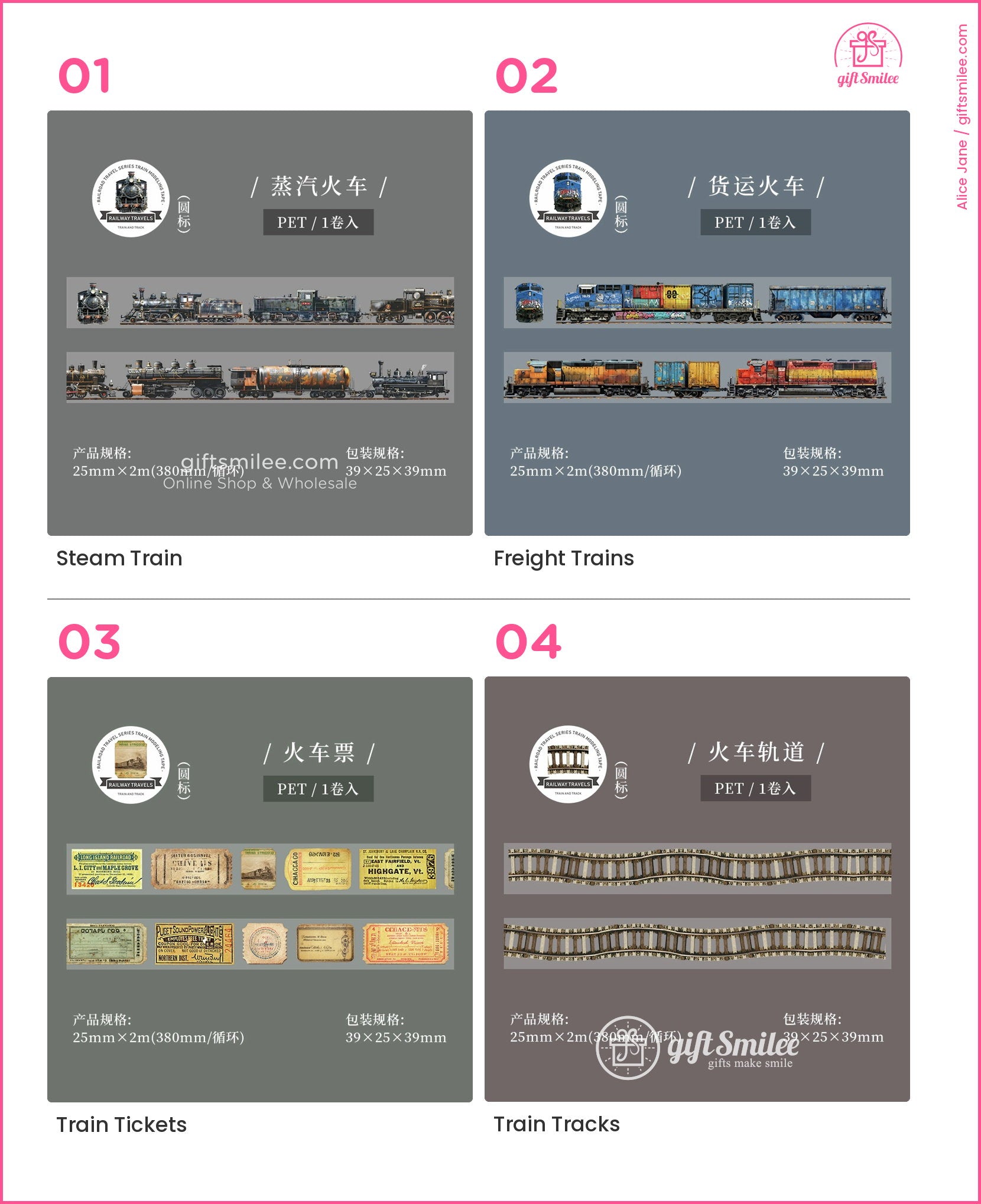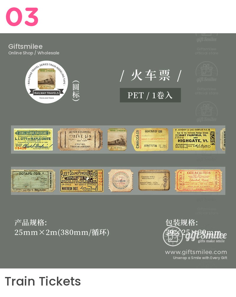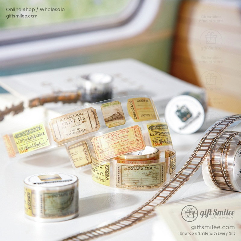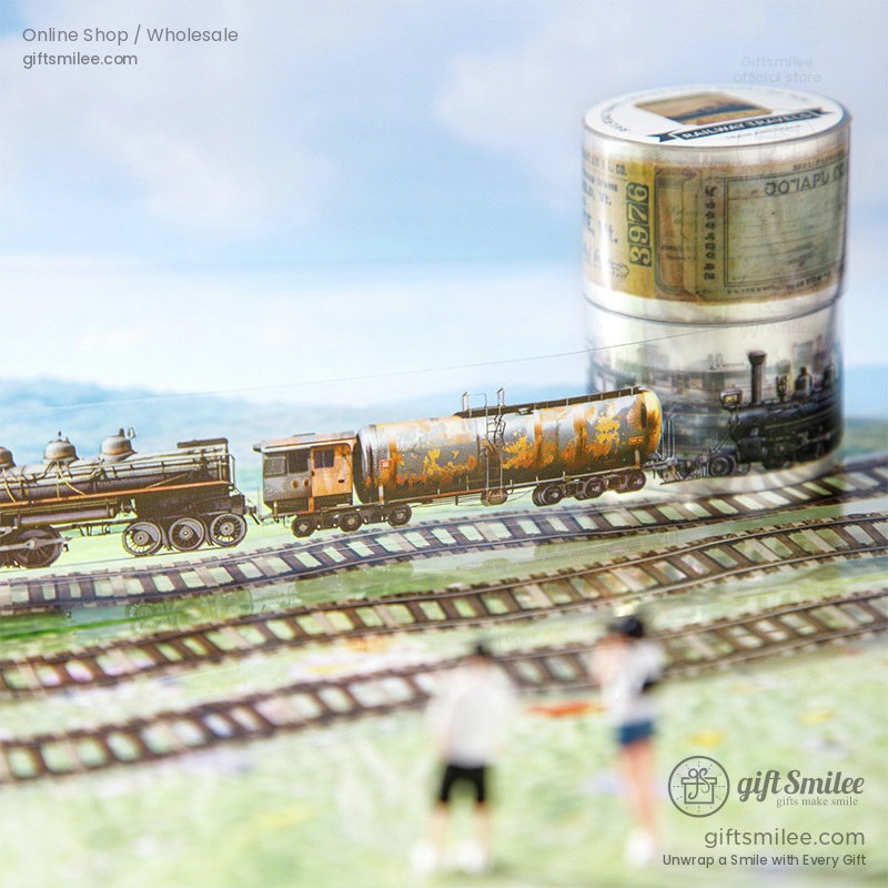 Faint sunbeams filter through the train's window, illuminating your desk as you unroll a translucent tape adorned with rusted locomotives and vintage tickets. Each detail, from the weathered train cars to the delicate typography of old destinations, whispers of a bygone era. The satisfying pull of the tape adds a tactile rhythm, mirrored by the soft clatter of real tracks in the distance.