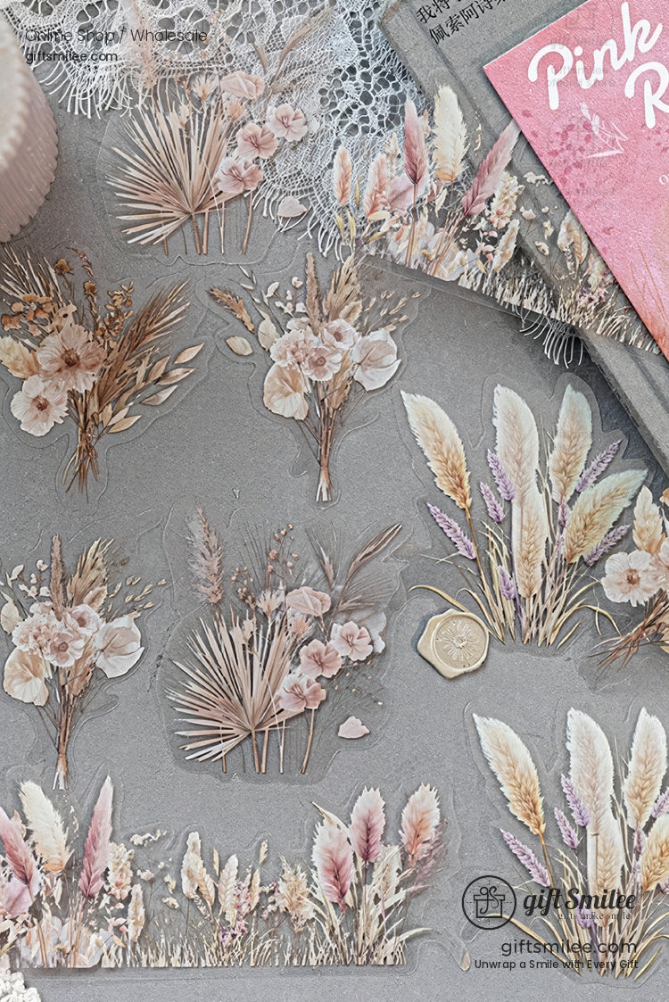 Torn edges of aged paper meet the delicate etchings of wildflowers and reeds. The muted tones of oat, brown, pink, and green seem to carry the warmth of an autumn breeze. Each piece feels like a memory pressed between the pages of a vintage diary, waiting to bring life to your creations.