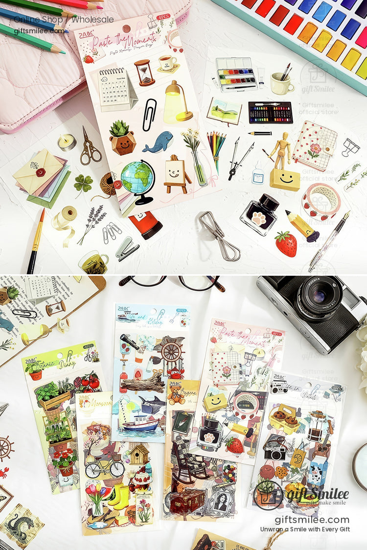 A desk scattered with mementos: a vintage camera collecting soft memories, a mug of steaming coffee cooling on a favorite novel, and sunlight catching on a delicate flower pressed in a notebook. Each sticker feels like a snapshot of a moment paused, waiting to be discovered and cherished.