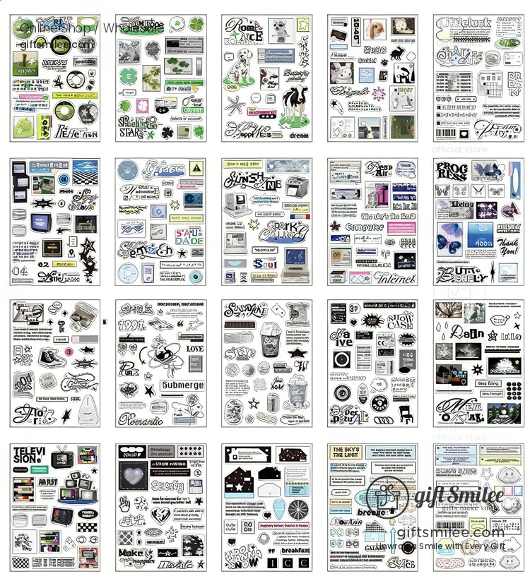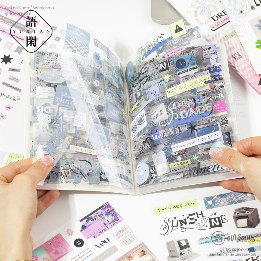 Crinkling pages and holographic accents catch the light as you flip through—a little slice of nostalgia wrapped in soft pastels and playful icons. Each sticker feels like a note passed in class, scribbled with inside jokes and dreamy doodles.