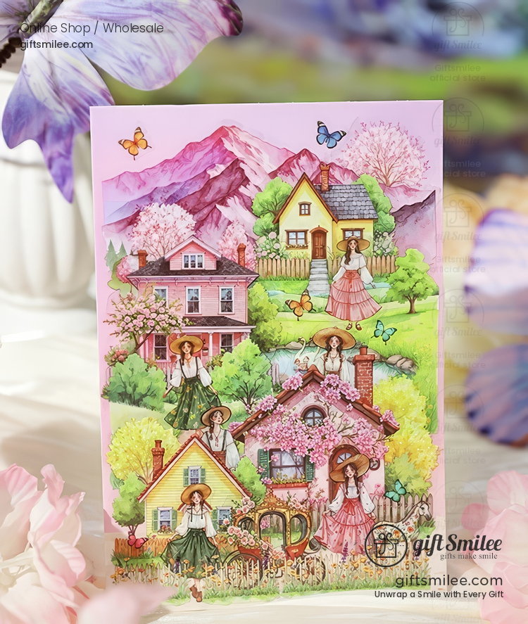 Nestled between pastel mountains and blooming gardens, a cobblestone street bustles softly with life. The air feels warm, carrying the faint scent of wildflowers and fresh pastries from a nearby café. Each house tells its own secret, wrapped in rose vines and the flutter of delicate butterflies, as a vintage car hums by under a golden sunset.