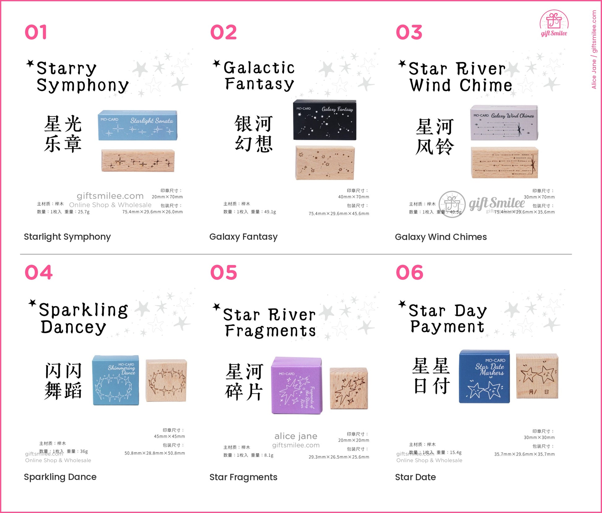 | Packaging Size | Starlight Movement: 75.4mm×29.6mm×26.0mm, Galactic Fantasy: 75.4mm×29.6mm×45.6mm, River Wind Chimes: 75.4mm×29.6mm×35.6mm, Shiny Dance: 50.8mm×28.8mm×50.8mm, Galactic Fragments: 29.3mm×26.5mm×25.6mm, Star Date Stamp: 35.7mm×29.6mm×35.7mm |